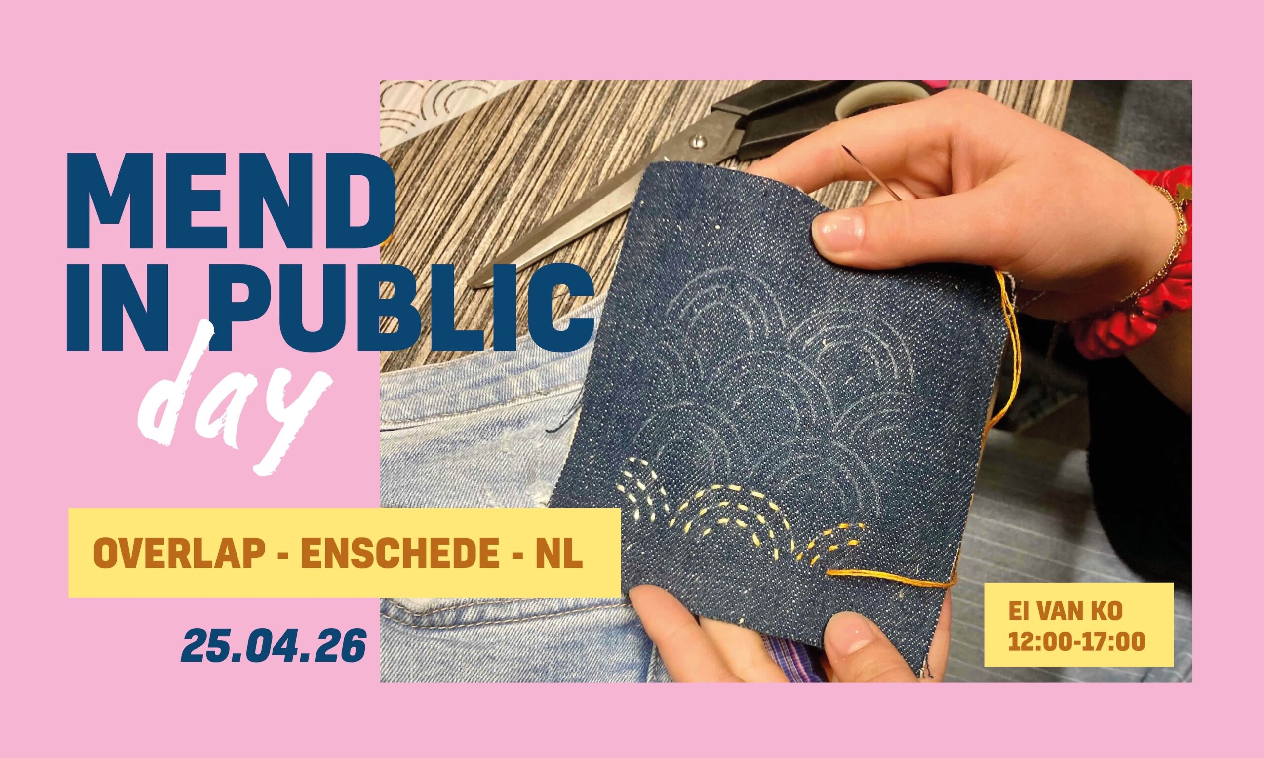 Mending your clothes in public as a revolutionary act! Bring your handicrafts and come to the 'sit-in' at 'Ei van Ko' between 12:00-17:00 in the city center across from Enschede Town Hall. We offer tips on mending clothes and also have some materials you can use to repair your clothes.