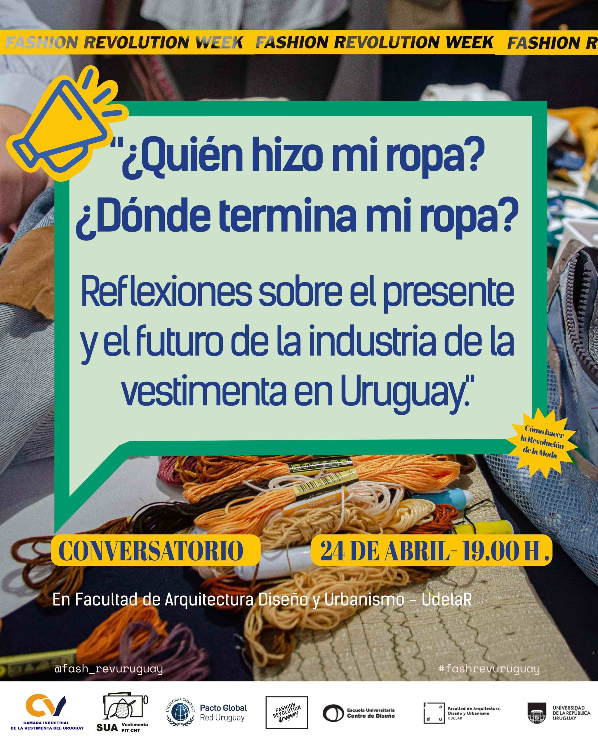 Participan: Cámara de la vestimenta, Sindicato de la Aguja, Pacto Global, Fashion Revolution Uruguay, Escuela Universitaria Centro de Diseño y la Facultad de Arquitectura, Diseño y Urbanismo (UdelaR)